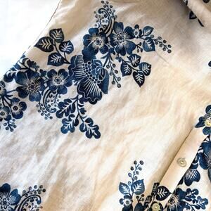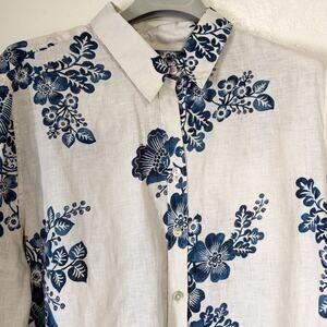 Beautiful 100% linen shirt featuring a striking navy watercolor floral print on a soft white background.
