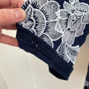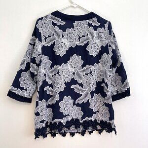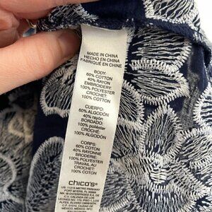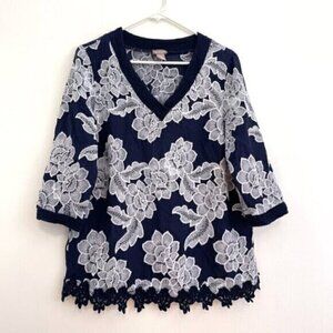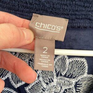 CHICO'S 2 Embroidered Floral Story 3/4 Sleeve Tunic Navy Blue White Floral Large