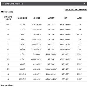 - Chico's size 2 // standard size large / 12 (size chart in photos)