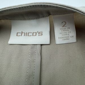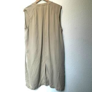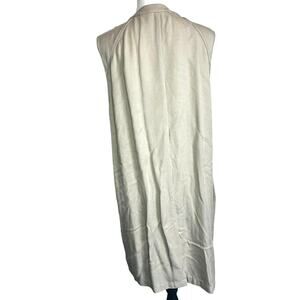 This Chico's long vest cardigan is a versatile addition to any wardrobe. The vest is made of soft lyocell material in a solid tan color and features a relaxed fit with a draped design. It has an open front and sleeveless style, making it perfect for layering over any outfit. The vest has pockets for added convenience and is suitable for travel, casual wear, and outdoor activities. It comes in size L and is ideal for women who enjoy nature, a hippie style, or a preppy look. The vest is lightweight, making it perfect for wearing in any season, whether it be winter, summer, fall, or spring.