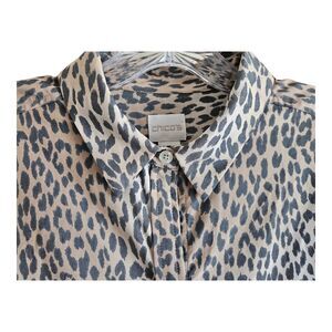 CHICO'S 2 = Women's Size 12 14 Blouse - Button Up, Front Pockets, Cheetah Animal Print, Tan, Gray, Long Sleeve, 63% Modal, 33% Polyester, 4% Spandex