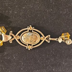 This elegant necklace features a stunning combination of pewtertone, pale green stone and gold beads, perfect for adding a touch of sophistication to any outfit. The tail pendant is 3" Long with one each of the 3 matching beads & a large gray green center stone with 4 Rhinestones.