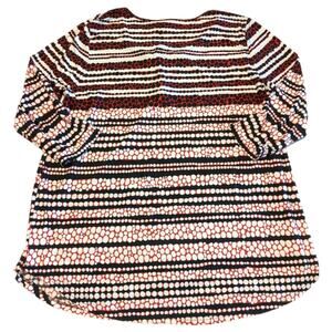CHICO'S red, black and white career top featuring a striped design with polka dots. 3/4 sleeves and a tied neckline.