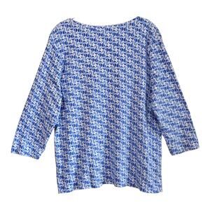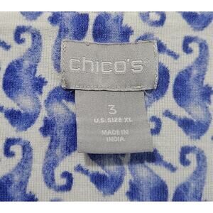 CHICO'S 3 = Women's XL Top - Pullover, V-Neck, Seahorse Pattern, Blue, White, 3/4 Sleeve, 100% Pima Cotton