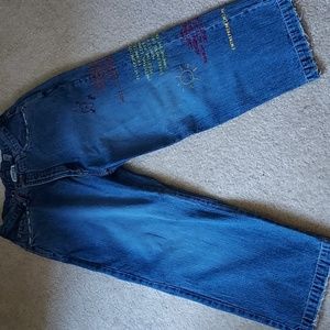 CROPPED 5 POCKET JEANS WITH COLORFUL EMBROIDERY A COMBINATION OF WRITING AND OBJECTS. INSEAM 22". SIZE 1 (UNIQUE TO CHICO'S WHICH EQUALS TO SIZE 8 AND 31:-32" WAIST).