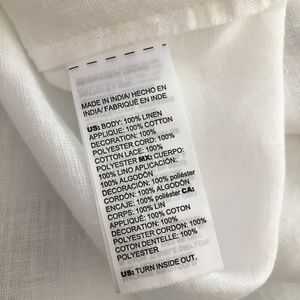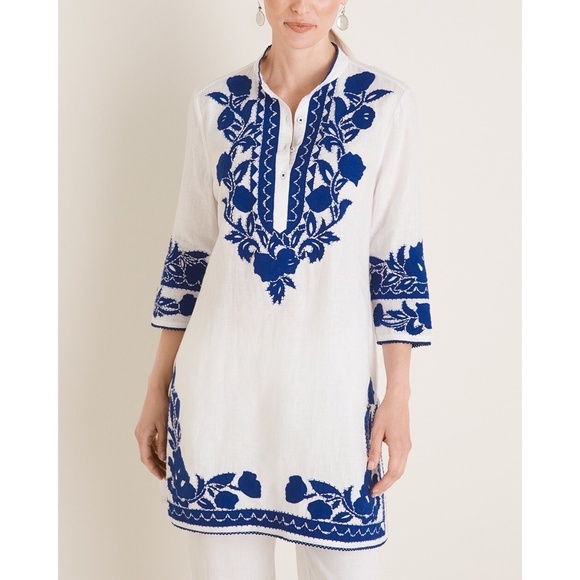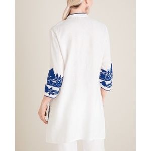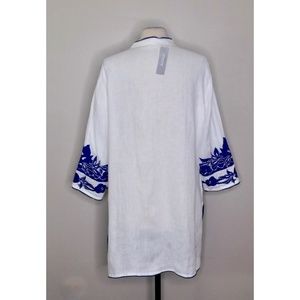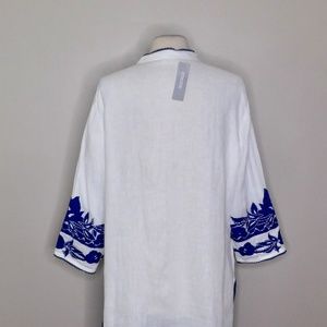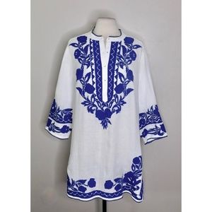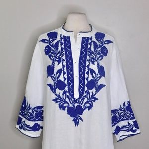 CHICO’S Appliqued Linen Tunic White & Blue Embroidered ~ Size 3 X-Large 16