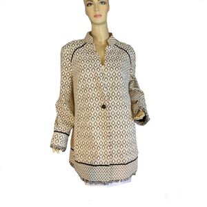 CHICO'S BLACK, CREAM & GOLD TAPESTRY MID LENGTH BLAZER (XL)