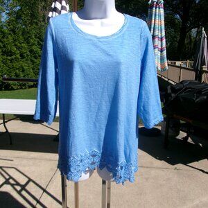 CHICO'S BLUE TYE DYE TOP WITH LACE HEM 0. TOP IS 100% COTTON 3/4 SLEEVES. BUST 34" LENGTH 25" SLEEVE LENGTH 15". P