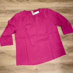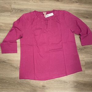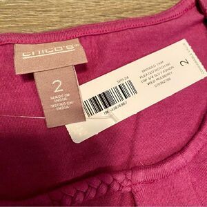 CHICO’S BRAIDED TRIM PLEATED 3/4 SLEEVE SHIRTTAIL TEE WILD MULBERRY 2 =L…