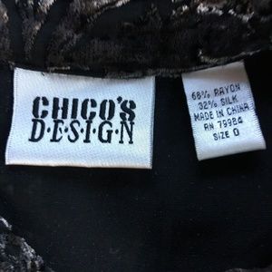 Gorgeous Chico's Black Silver Velvet Burnout Tunic Size 0 (Small). Sheer. Buttons up to the collar. 7" side vents. Excellent Used Condition. Perfect for the holidays.