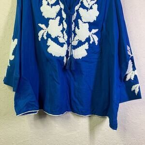 CHICO'S Blouse Embroidered Three-Quarter Sleeve Tassel Tie Neck Peasant Boho Top