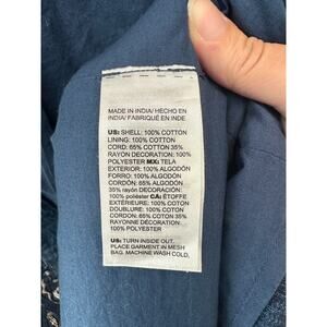 Add a touch of global artisan charm to your wardrobe with this stunning open front jacket by Chico’s. Crafted in richly textured cotton, it features intricate metallic and navy embroidery in a regal medallion design and a denim indigo wash.