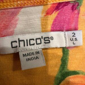 Bright and colorful Chico's shirt in size 2, perfect for adding a pop of color to any wardrobe. Lightweight and comfortable, ideal for casual or festive occasions. Pair with jeans or skirts for a vibrant look.