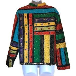 Bright Colors of red, green, turquoise, purple and yellow. Embroidered and embellished with metal beads, sequins and mirrors. Artistic metal buttons run down center front. Shell is 100% Cotton and fully lined in 100% Polyester. The embroidery is 100% Rayon.
