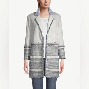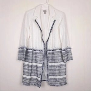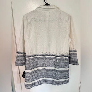 Chicos Eyelet Jacket Embroidered Fringe / Chicos White & Navy Eyelet Open Jacket Size 1P / Dressy Casual Summer Cotton Jacket