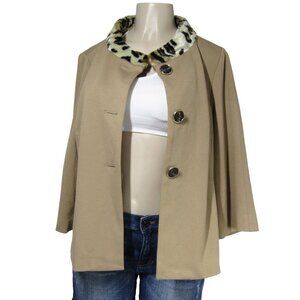 Retro-inspired CHICOS swing jacket in a chic camel tan. Features leopard print faux fur collar, size 1, perfect for a stylish woman seeking a unique addition to her wardrobe.