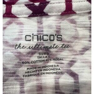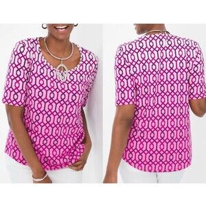 The CHICOS Chicos Ombre Hexagon Elbow Sleeve Tee is a stylish and versatile top perfect for casual occasions. Made from a comfortable cotton-modal blend, this tee features a scoop neckline, short elbow sleeves, and a curvy shirttail hem. The geometric ombre hexagon pattern in shades of pink and purple adds a touch of color and elegance to the classic and breathable design. Ideal for summer, fall, and spring, this pullover shirt is machine washable and easy to care for, making it a practical and fashionable choice for everyday wear. 18 inches pit to pit and 24 to 26 inches long. Smoke free home.