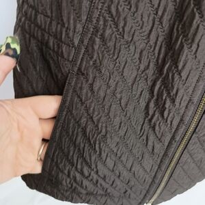 Embrace a blend of style and functionality with this Chico's brown quilted vest. Its diamond-pattern quilting and collarless design offer a sleek look, while the full-length zipper ensures easy wear. Ideal for layering, this vest is a versatile addition to your wardrobe.