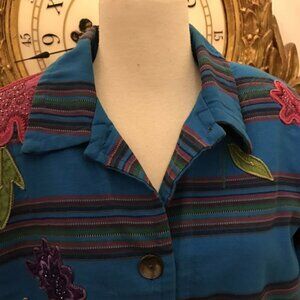 CHICO'S Cotton Jacket Size 2 (M). Silk Appliques, Beading, Embroidery. Excellent pre-loved condition. No spots, tears or damage. Center back length is 26". Sleeve length incl. cuff is 22". Bust is 44". Dry Clean.