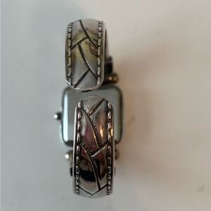 Classic Chico’s watch in silver. Cuff style, with spring hinge. Square face. Etched design, antique look. 2.25” diameter. Firs smaller wrist. Working, will put a fresh battery in before shipping. Very good condition.