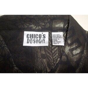 PRE-OWNED CHICO'S DESIGN 2 SIZE M BEAUTIFUL LONG BUTTON DOWN SHIRT.LONG SLEEVE,MANDARIN COLLAR,GOLD BLACK FLORAL PRINT 60% SILK 25% RAYON DRY CLEAN.TOP IN EXCELLENT CONDITION NO TEARS STAINS OR ANY OTHER DAMAGE,COMES FROM NON SMOKING HOME.MEASUREMENTS LYING FLAT DOWN:ARMPIT TO ARMPIT: 22 1/2"SHOULDER TO SHOULDER: 18"LENGTH: FROM SHOULDER TO HEM : 33"PLEASE CHECK MEASUREMENTS AND FEEL FREE TO ASK QUESTIONS.WILL ACCEPT RETURN WITHIN 30 DAYS OF RECEIVING THE ITEM,RETURNED ITEM MUST BE IN THE CONDITION AS RECEIVED UNWORN UNDAMAGED,BUYER PAYS RETURN SHIPPING.