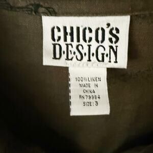 This is a great Tunic top from CHICO'S DESIGN! Size 3, which translates to a US XL. 100% Linen, button down. Dark Olive green with black pattern.