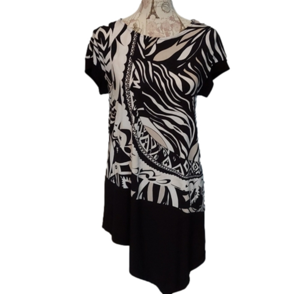 Excellent Condition Black & Cream Pattern Cap Sleeves Asymmetrical Hemline Light Weight 96% Poly 5% Spandex 18" Armpit to Armpit lying flat 30" Length (N)