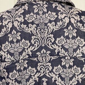 Stylish embroidered paisley jacket with detailed silver buttons and front pockets. Great for the office or running errands. Measures 21 inches in length. Pit to pit measures 20 inches. Shoulder to shoulder measures 15 inches. Made from a blend of cotton/polyester/spandex. Excellent preowned condition/