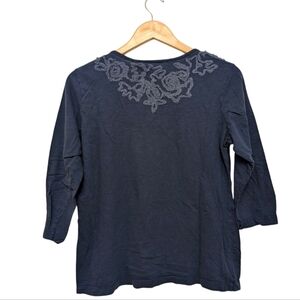 Cute embellished denim fabric on this navy faded scoop neck Size 2 Chico's 3/4 Sleeve Top