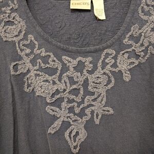 CHICOS Embellished Denim Blue Top Cotton Scooped Neck Elbow Sleeve Navy Tee Sz2