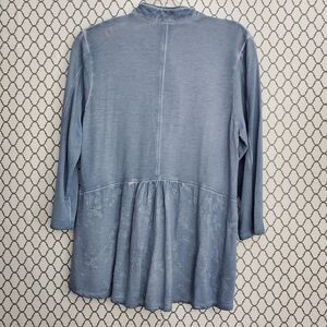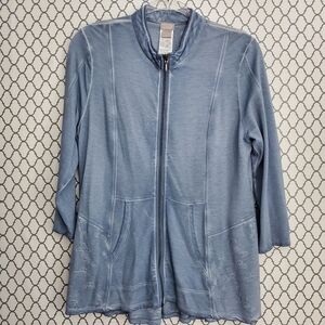 Simple sophistication is at your fingertips with this oil-washed jacket, featuring a flattering away-from-the-body fit with 3/4-sleeves and front pockets, plus stunningly subtle embroidery at the sides and back hem.