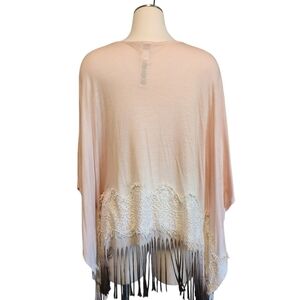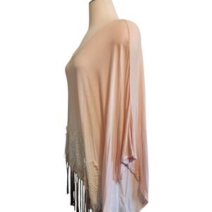 this poncho. The fringe hem is so much fun. Ombre color from pink to dark brown. Dedicated arm holes with lace trim and fun fringe.