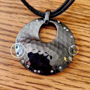 Special Features: Beautiful Hammered Gunmetal Black Cut-Out Pendant, Tiny Crystal Accents, Textured Details, Black Leather Double Cords, Lobster Claw Clasp, Gunmetal Black Extension, Chico's charm and Black Bead at nape. Stunning ✨️