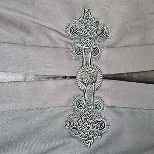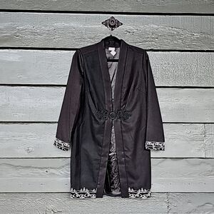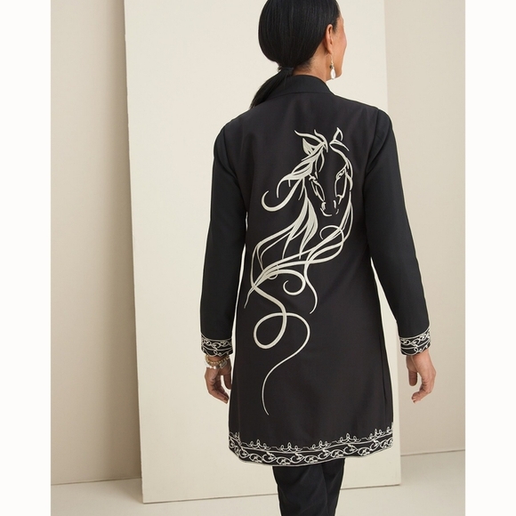 Equestrian style goes elegant in this embroidered horse jacket. Embroidered scrollwork accents the hem and cuff of this long-sleeved topper and an ornate frog closure camouflages the hook-and-eye closure in front. In back, the elegant silhouette of a horse adds unexpected art to the design.