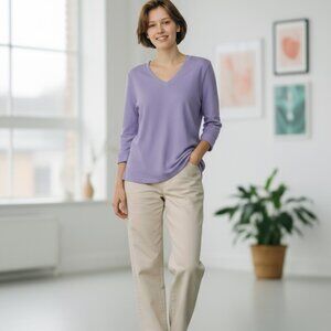 An elevated tee, crafted with lightweight and luxurious pima cotton. Expertly designed with breathable pima cotton fabric, this iteration features a flattering V-neckline and shirttail hemline for ease of wear. A lovely, soft cotton shirt so comfy you'll wear it over and over. Soft shade of lavender goes well with jeans or a work skirt. The workmanship is first-rate, with detailed neck, hips, and sleeve stitching. The hip is slightly flared, so it fits nicely--no holding your tummy in! This item was never worn.