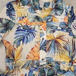 Tropical Botanical print 100% linen blazer style jacket. Snaps up front, drawcord synch at waist with pockets. Chicos size 0.