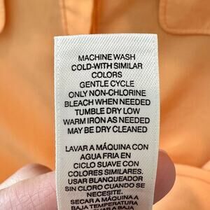 This melon orange blouse from Chico’s brings vibrant elegance to your wardrobe. Designed with a silky-smooth polyester fabric, this tunic-style top features a collared neckline, split button placket, two front flap pockets, and elbow-length cuffed sleeves. The back pleat detail adds subtle structure and flow for a flattering silhouette.