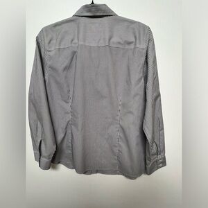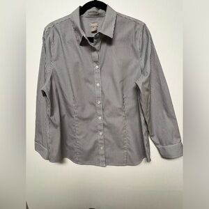 CHICO’S NO IRON COOLMAX ALL SEASON BLOUSE. GREY PINNED STRIP. SIZE 2 (12-14)