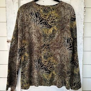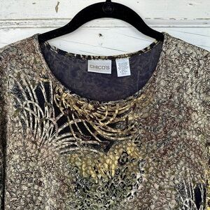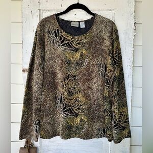 CHICO’S, NWOT, WOMENS, BLACK WITH GREEN & GOLD COLORS, LONG SLEEVE TOP. ROUND NECK, STRETCHY FABRIC. SIZE 2