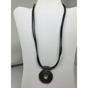 CHICO'S Necklace Open Circle Pendant Dark Patina Silver Tone Black Cord BOHO