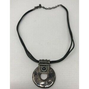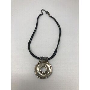 CHICO'S Necklace Open Circle Pendant Dark Patina Silver Tone Metal Black Cord BOHO
