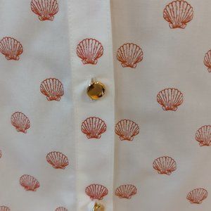 CHICO'S No Iron Seashell Button Down Shirt with gold buttons and gold "D" latch style cuff up sleeves.