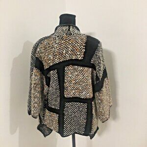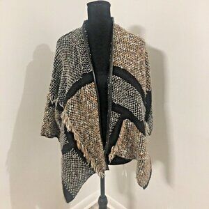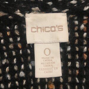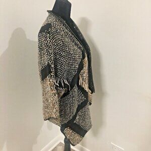 CHICO'S Open 3/4 Sleeve Fringe Patchwork Cardigan Faux Leather Trim Sz 0 or S