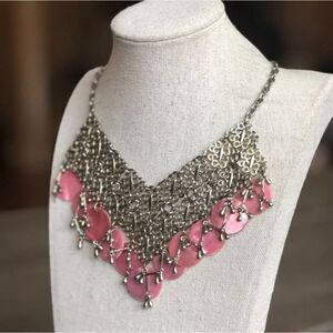 This stunning Chico's statement bib necklace is a remarkable fusion of elegance and artistry. It features an intricate silver-tone scroll design, exuding a vintage-inspired charm with its delicate filigree patterns. The necklace is adorned with pink shell dangle pendants, their smooth, glossy surfaces catching the light beautifully. These pendants cascade gracefully along the bib, adding a touch of soft, feminine allure.