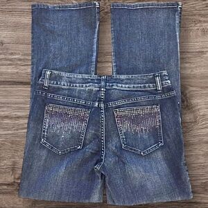 Classic and stylish medium wash bootcut jeans with subtle sparkle detailing, perfect for dressing up or down.