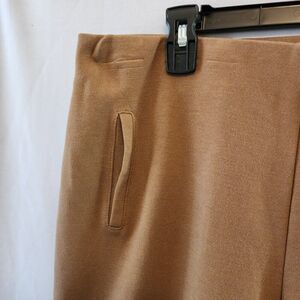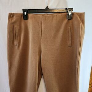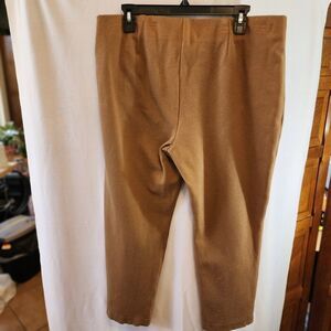 NAME: CHICO'S PONTE KNIT SLIM ANKLE PANTS, SIZE 2.5 (LARGE - 14) LEG OPENING HAS A SIDE SLIT, VERY SOFT, WAIST HAS COMFORTABLE ELASTIC BAND, FRONT POCKETS ARE DECORATIVE ONLY, CAMEL/TAN