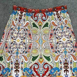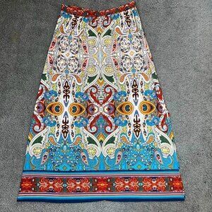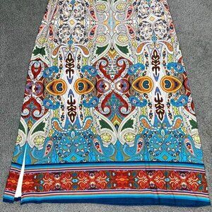 Chico's paisley geometric jersey knit maxi skirt in blue, orange, purple, green, and cream. Side slit. Elastic waistband, pull on style.