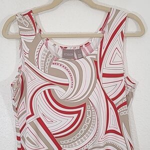CHICO'S Red/White/Taupe Geometric Patterned Sleeveless Top, size 1 (Small). Material has stretch. Gently pre-owned.