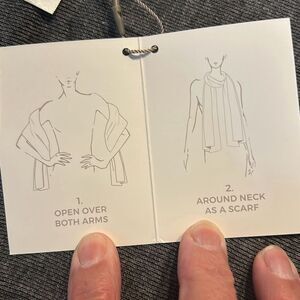 Perfect for travel or gift. Chicos, reversible, travel, travel wrap. We’re three different ways, one size fits most. Comes in its own little travel bag. Black reverses to gray, two sides, slits for hands and arms, where, as a scarf as well. Last picture shows in animal print wrap, this one is gray and black.
