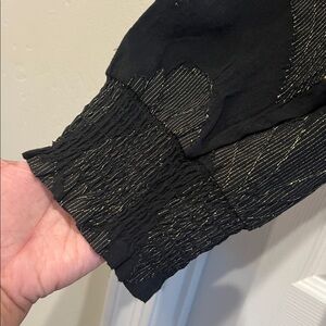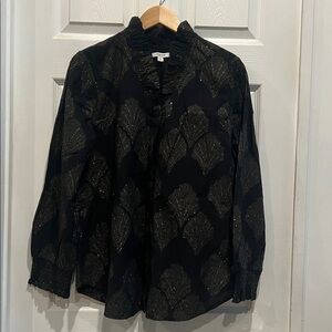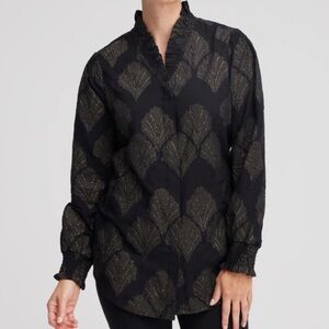CHICOS Ruffled Black and Gold Button Front Top